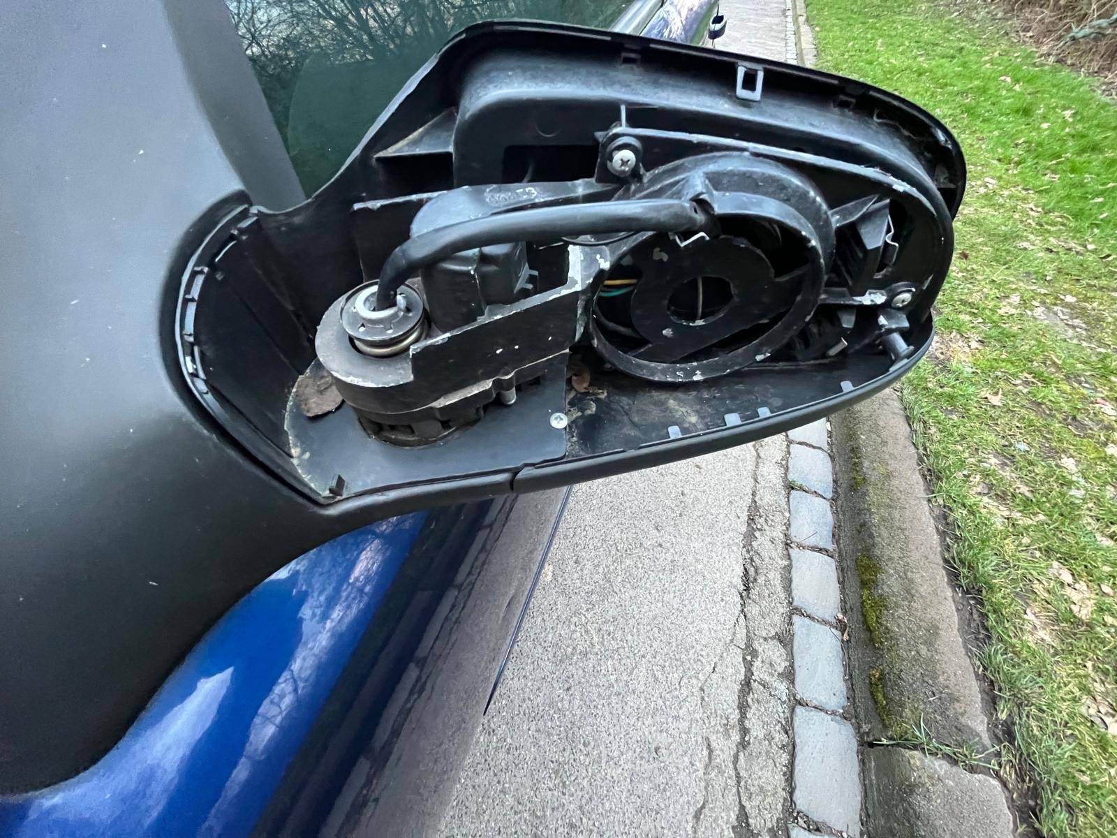 Am linken Außenspiegel fehlt lediglich die Abdeckkappe, der Spiegel funktioniert einwandfrei.