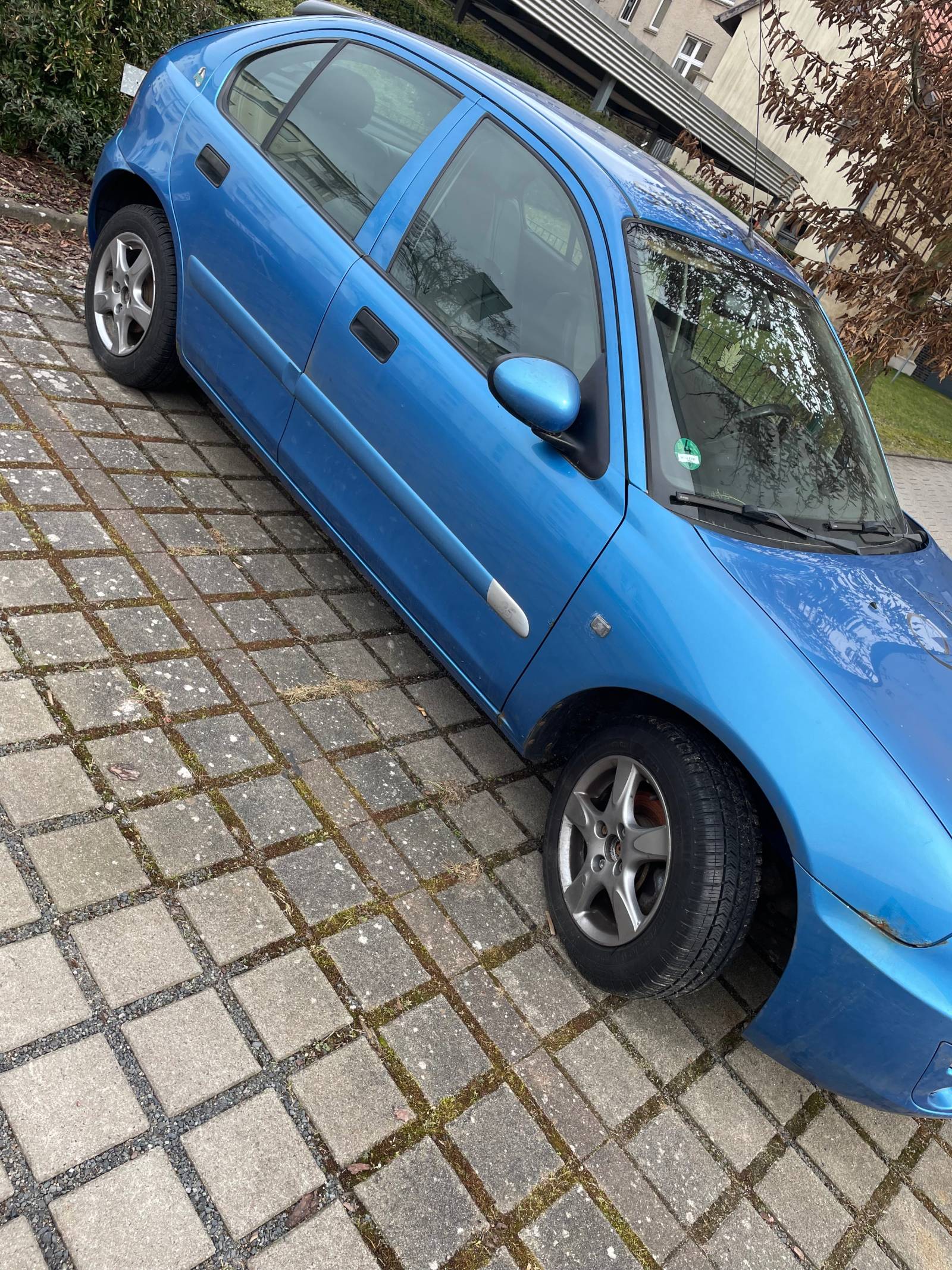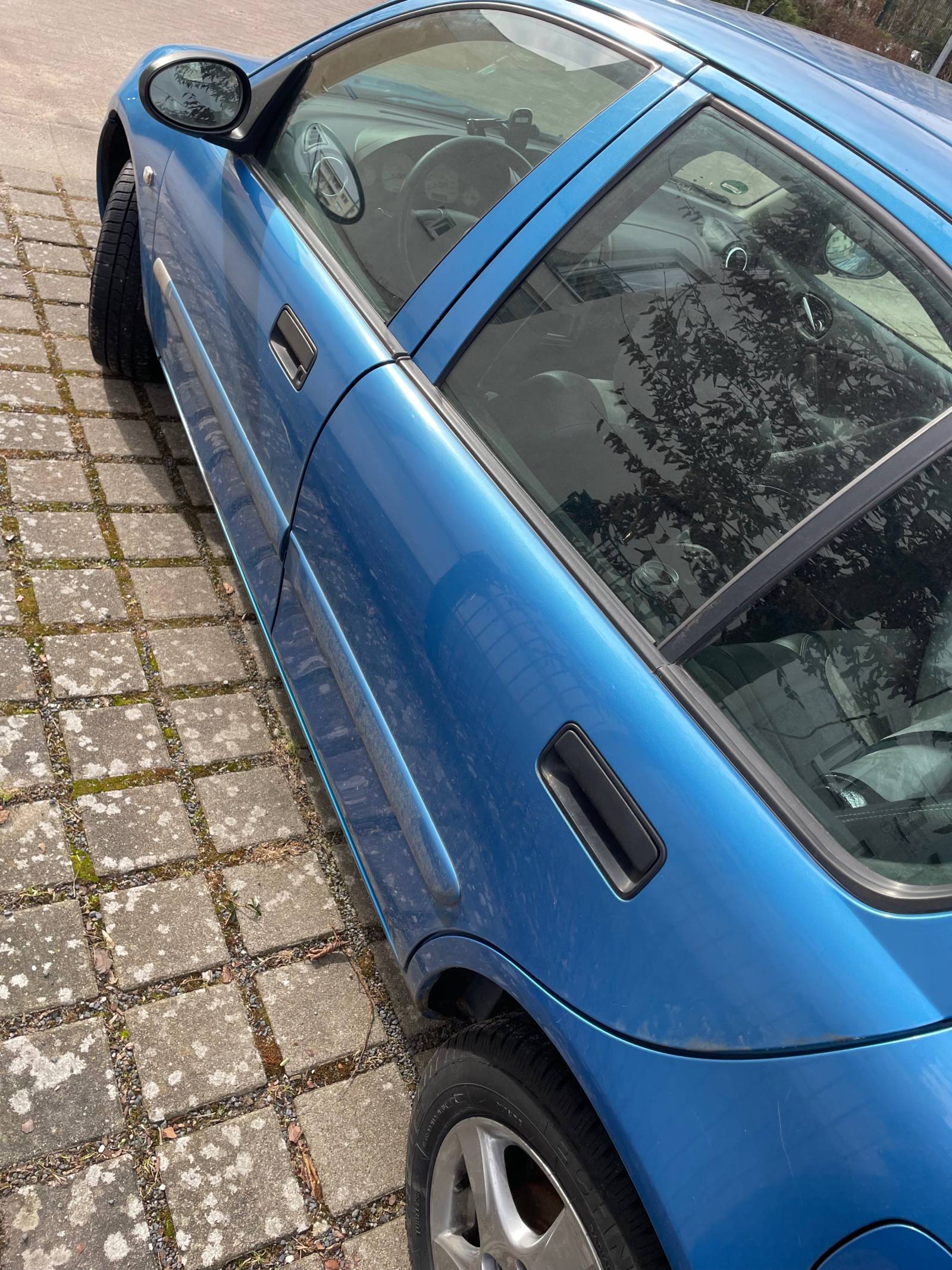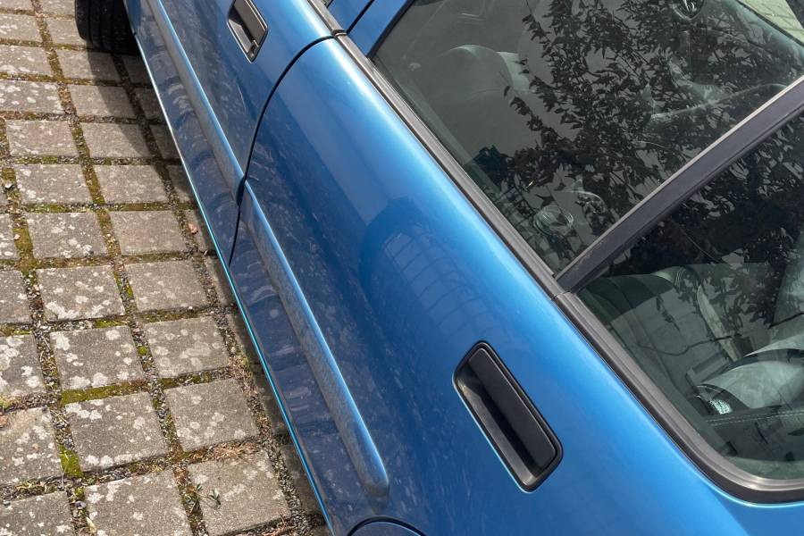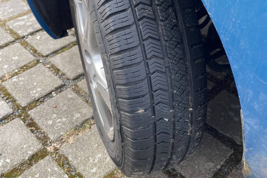 Der Motor läuft ruhig (für das Alter), Bereifung ist ein Jahr alt. Der Himmel löst sich langsam, es liegt ein Kabel für eine Dashcam im Fahrzeug und es befinden sich Roststellen auf dem Kfz
