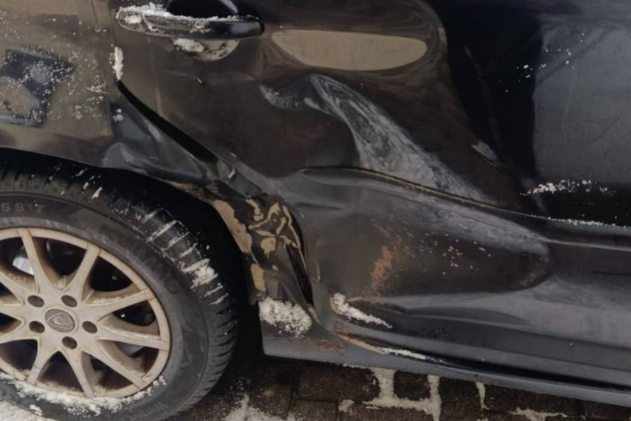 Rechte hinterer Tür nicht zu öffnen weil schwer beschädigt durch Zusammenstoß mit anderem PKW.